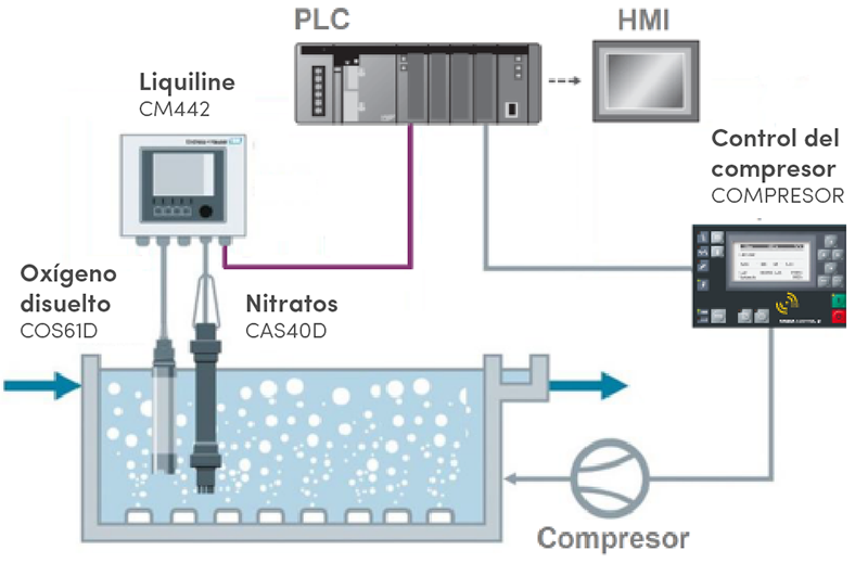 La combinación de mediciones de oxígeno, amonio y nitratos con un control de la aireación en función de la carga de la planta tratadora puede ayudar a los operarios a mejorar el rendimiento, reduciendo las emisiones y reforzando la seguridad y la eficiencia energética. Para ello es necesario un control de aireación a través del valor de medición de oxígeno disuelto para el suministro de entrada de aire que garantice la retirada del nitrógeno por des-nitrificación. Asegurar la cantidad exacta del consumo de energía en la fase de aireación resulta crítico para minimizar los costos energéticos. El cumplimiento de valores límites permitidos por los organismos reguladores y una eficiencia energética son factores críticos en el funcionamiento de una PTAR.