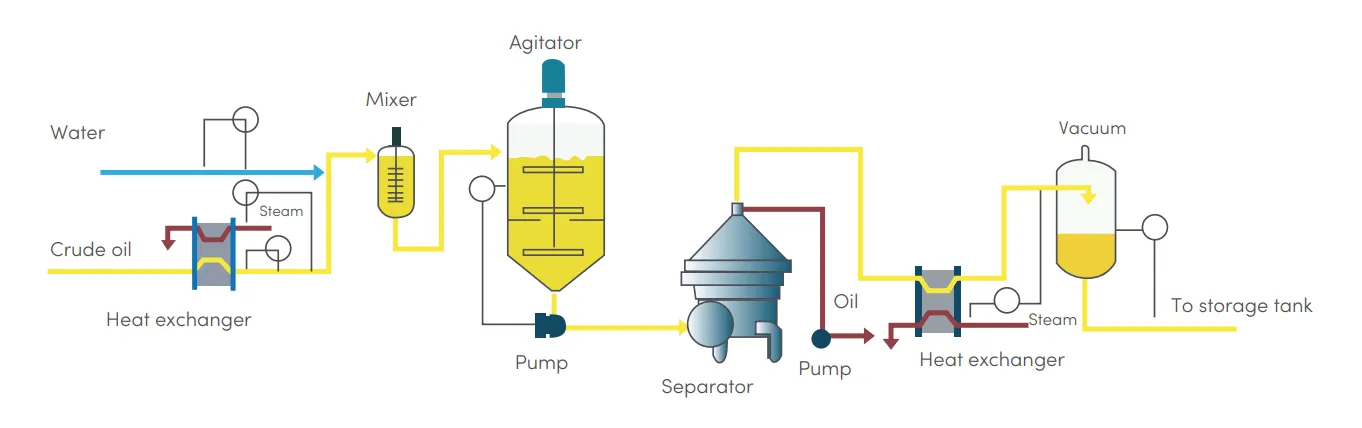 Degumming of oil is the first step in an oil refining plant and is essential in the refining of vegetable oil. It can be done by hydration. Degumming of oil by hydration consists of adding hot water since impurities like phosphatides, gums and proteins are soluble in oil, but insoluble in water. That way, impurities can be separated.
