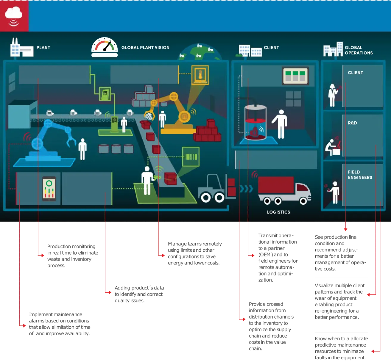 Our solution combines information for mobile users through an interface that overlays data in real time and virtual objects in machines, control panels or processes; allowing users immediate access to relevant machine and process information.