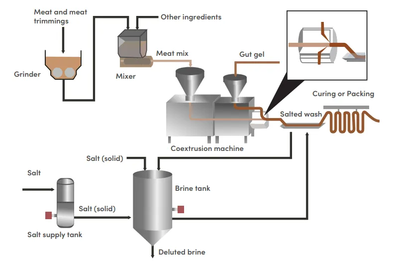 Sausages are made by grinding different types of meat and mixing the ground protein with various ingredients and water. The resulting mix is then packed into different presentations for the consumer.