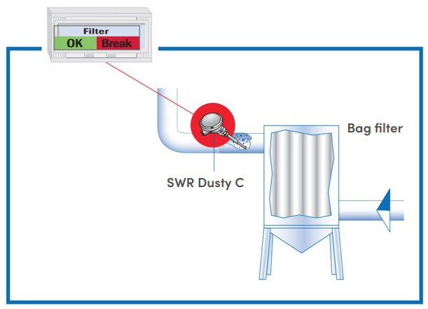 SWR's Dusty C system was specially developed to reliably monitor clean sides after filters to prevent bag filter breakage. The Dusty C can be used in metal ductwork where dust particles in the gas stream must be detected. Its measuring range starts with dust concentrations of 0.1 mg/m3. The sensor can be used in areas to prevent explosion risks (dust zone 22 / gas zone 2).