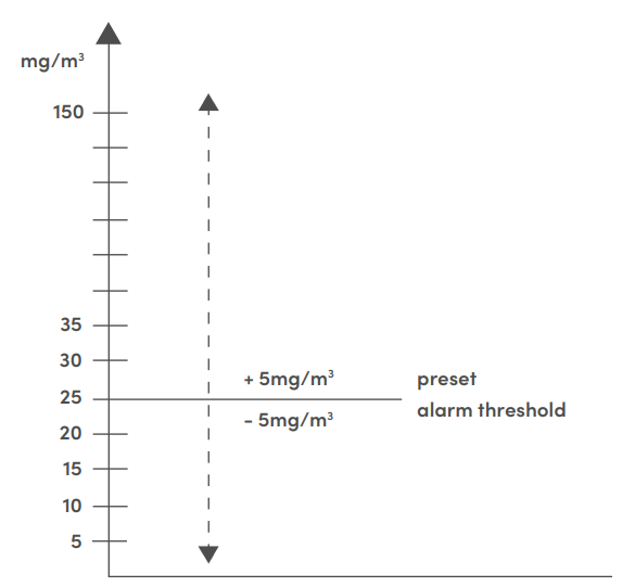 The sensor provides the user with the option to define the alarm set points. This can be done in a range between approx. 5 mg/m³ and approx. 150mg/m³. The switching value can be varied in steps of 5mg by pressing a button.