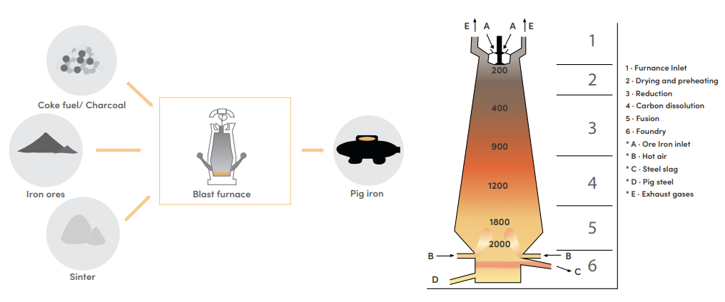 Indirect reduction: Iron ore is transformed using a blast furnace (BF) to obtain pig iron, which is then refined to produce steel. This is the process used in blast furnaces.