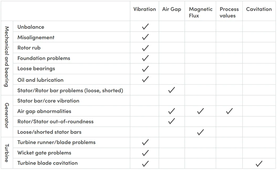 Measurements are processed to generate alarms in each case, as well as the ability to analyze frequency component spectrum and determine bearing wear, gear wear or displacement.