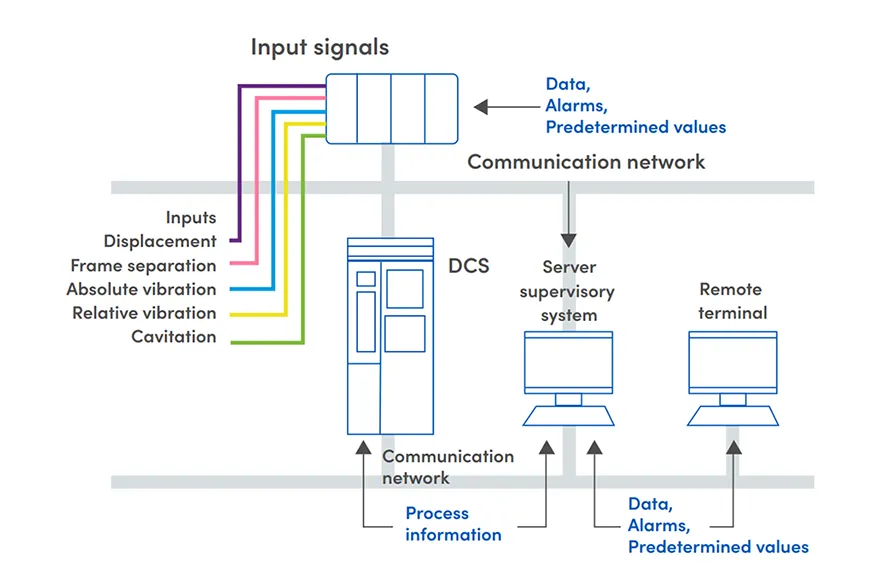 Condition supervisory system can be linked to the plant process control system (DCS o SCADA), business management and maintenance systems, emergency shutdown system and KPI generation.