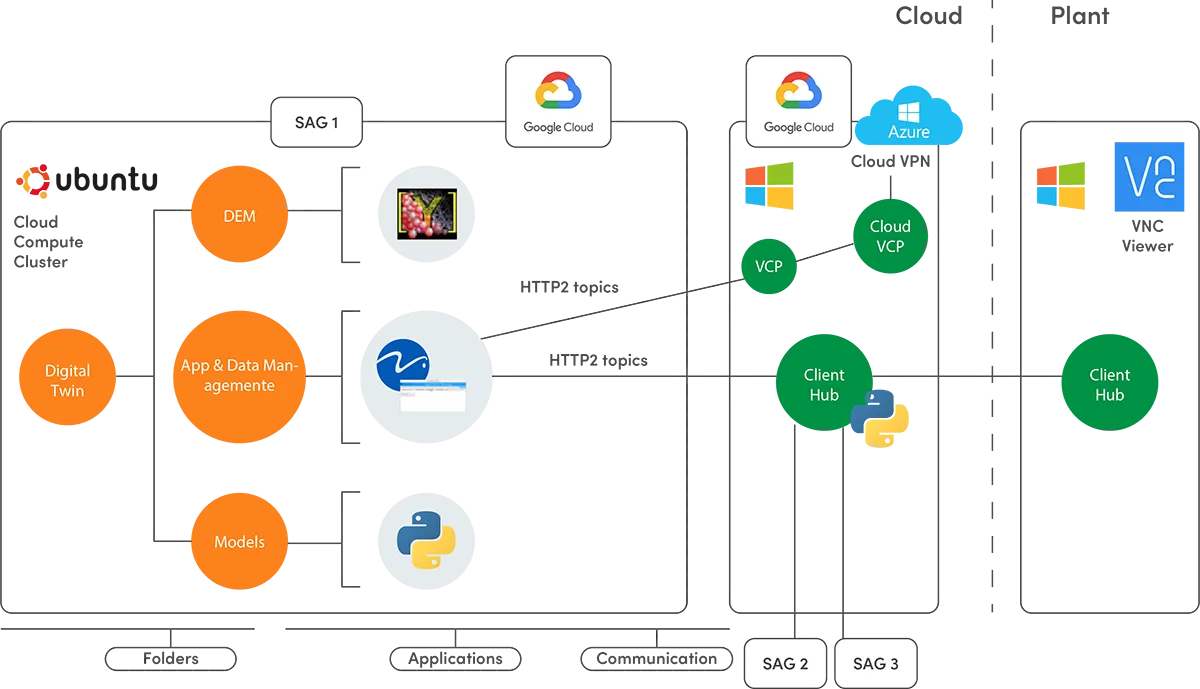 El Gemelo Digital esta alojado en la nube de Google, llamada Google Cloud Platform (GCP). Los datos de planta se integran utilizando el IoT Core de GCP, en donde mediante una conexión segura, las variables de proceso del circuito de molienda son enviados mediante estas tres opciones: