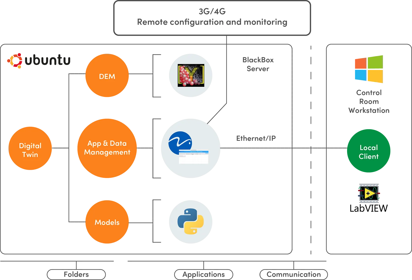 El Gemelo Digital "On-Premise", se instala en servidores locales bajo el concepto de "Caja Negra", la cual solo tiene conectividad al exterior mediante un puerto de red industrial para conectarse al cliente local desarrollado en Labview y cuanta con una conectividad vía 3G o 4G para conectarlo a Internet para su configuración y mantenimiento remoto.