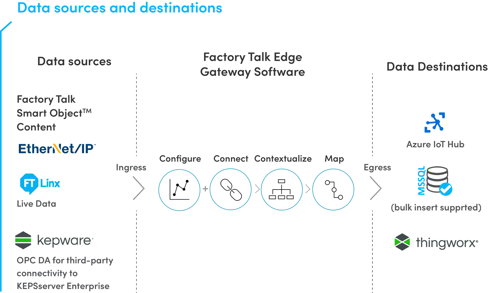 FactoryTalk Edge Gateway software unifies data from industrial sources and automation or control systems. It integrates with a variety of cloud, IoT, and big data applications, including ThingWorx, Microsoft Azure IoT Hub, Microsoft SQL, and more. It also uses OPC-DA, the automation industry interoperability standard, to access KEPServer Enterprise data for third-party connectivity. This maximizes operational insights and provides a 360-degree view of your business, simplifying and automating data ingestion in a single integration solution for IT applications.