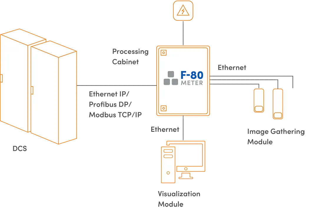 These images are sent to the processing panel where they are processed and analyzed, later they are sent to the DCS through the industrial communication Ethernet IP, Profibus DP, Modbus TCP / IP. The advanced display module links to the processing module via Ethernet IP.