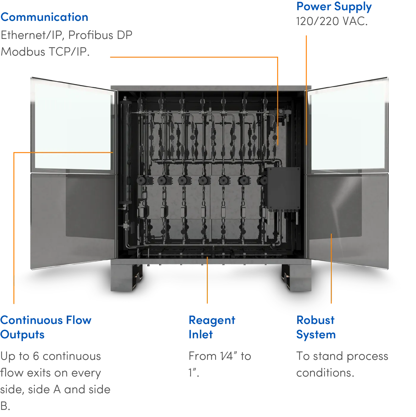Plug & Play container where the UD Line and Master controller are located, the system is pre-commissioned and ready to connect electrical power, industrial communication and reagents inlets & outlets, making it easy and faster to get it up and running.
