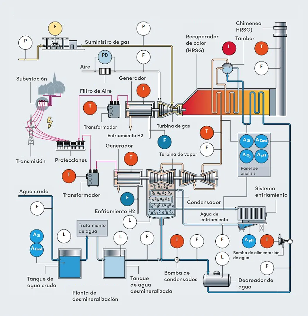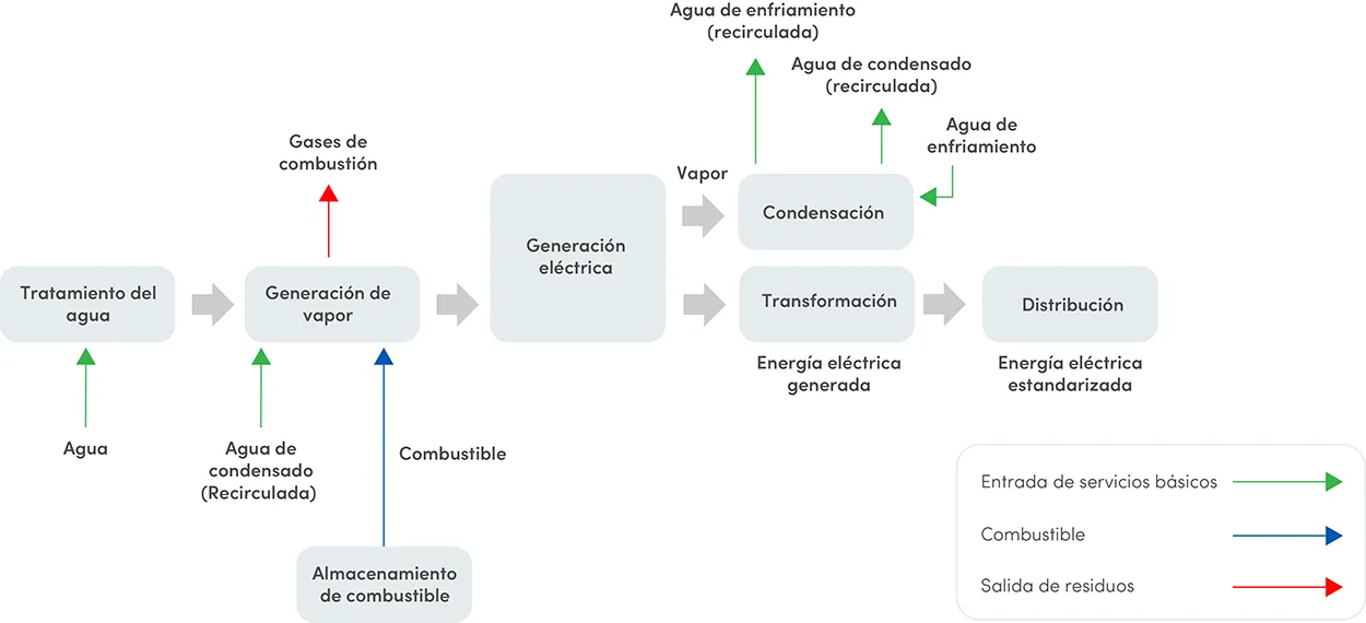 La central termoeléctrica convierte la energia termica del vapor en energia cinética transferida a una turbina que hacen mover el rotor de un generador que convierte finalmente esta energía en eléctrica.